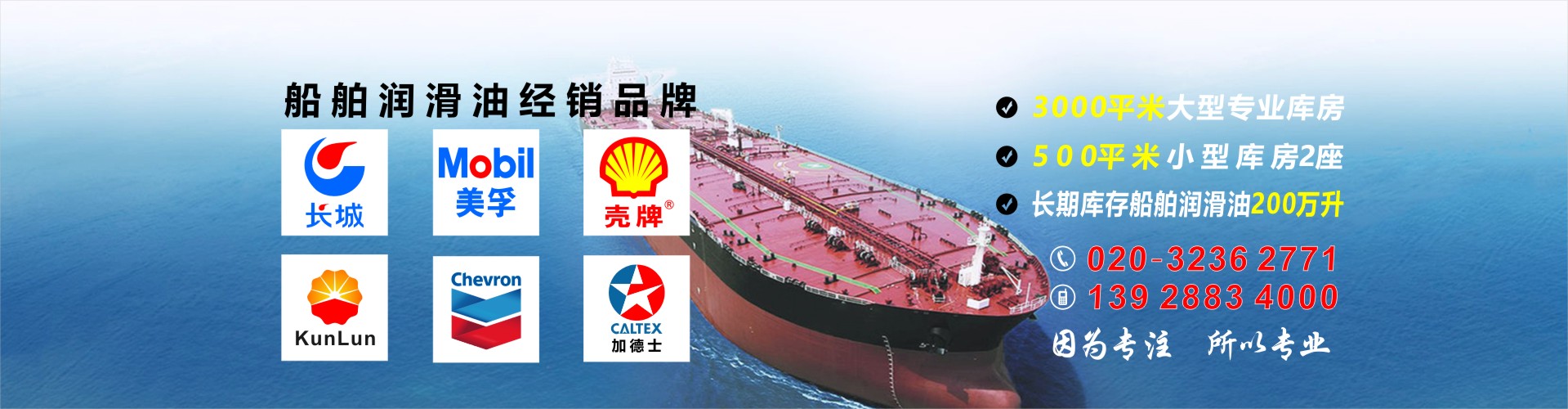 廣州市誠(chéng)專潤(rùn)滑油有限公司是中石化長(zhǎng)城潤(rùn)滑油船用油專業(yè)代理商,從事船舶潤(rùn)滑油銷售、運(yùn)輸、加注服務(wù),是專業(yè)船舶潤(rùn)滑油服務(wù)平臺(tái)。